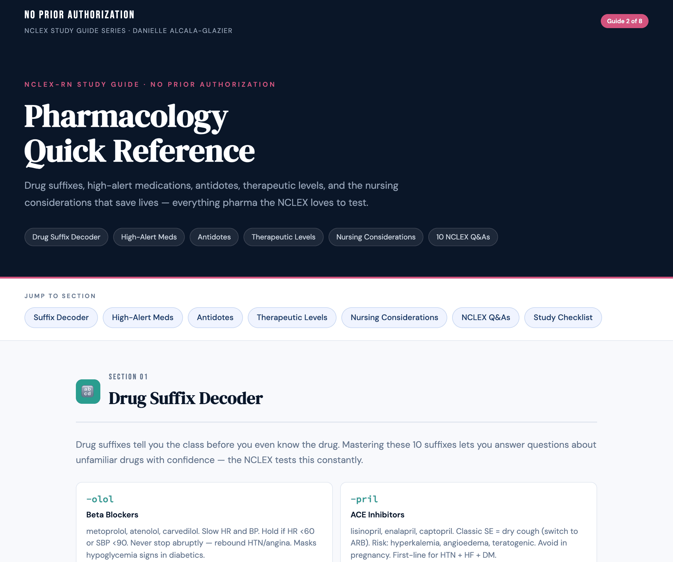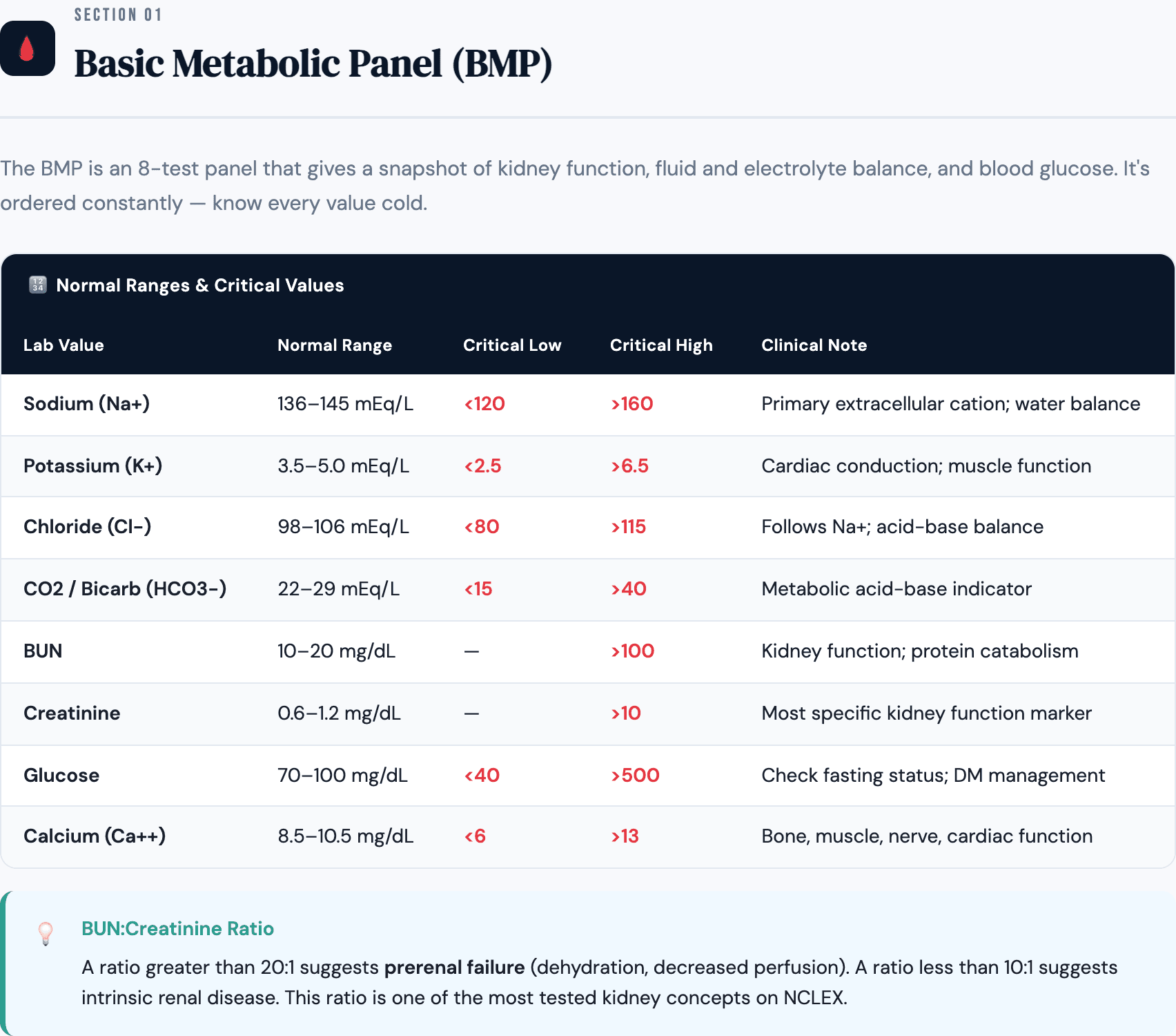 Eight print-ready HTML files: at-a-glance tables plus full structured guides — lab values, pharmacology, EKG, acid–base, priority, infection control, OB, and mental health. Open after purchase, print or save as PDF.